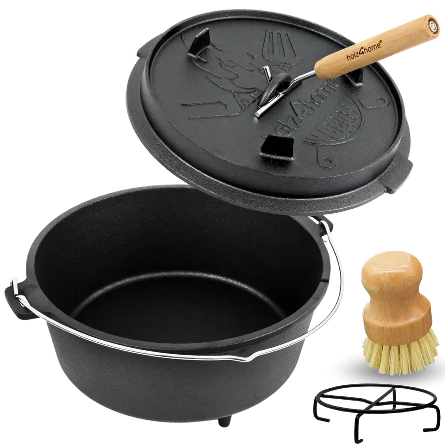 holz4home Dutch Oven 9L Eingebrannter Feuertopf aus Gusseisen Inklusive Deckelheber Topfständer und Reinigungsbürste